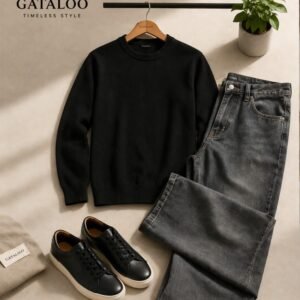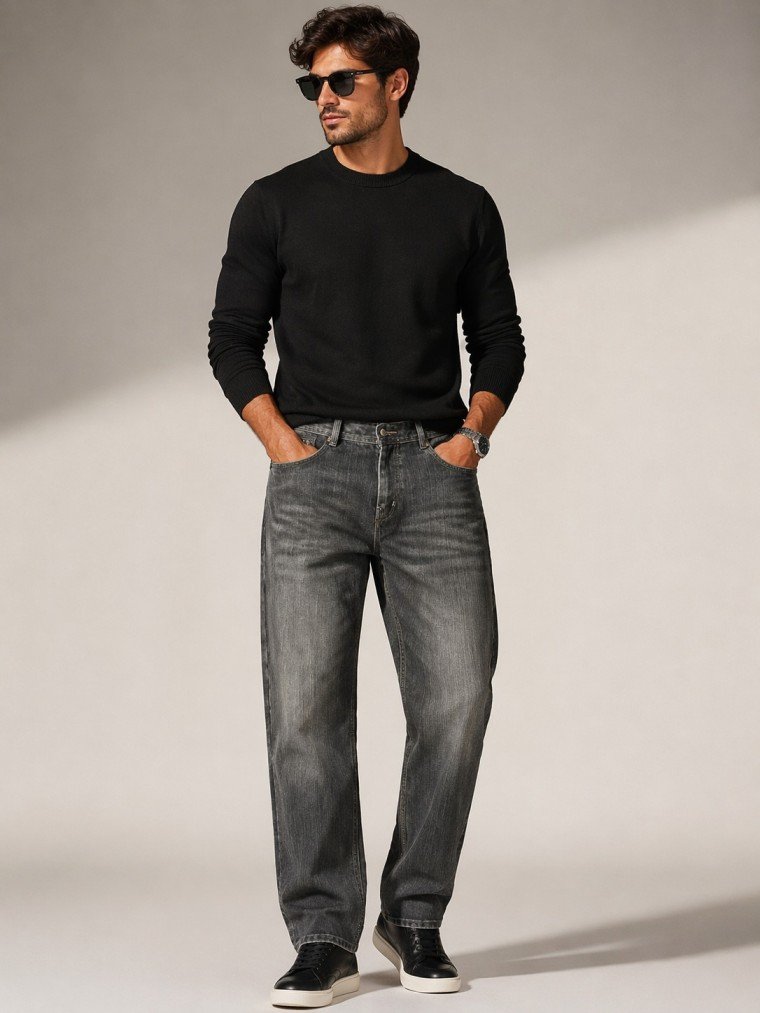 Step into effortless style with this Men’s Black Crew Neck Sweater paired with Grey Washed Jeans, a timeless combination that defines modern casual fashion. The sleek black sweater gives a clean and premium look, while the faded grey denim adds a rugged, stylish edge.