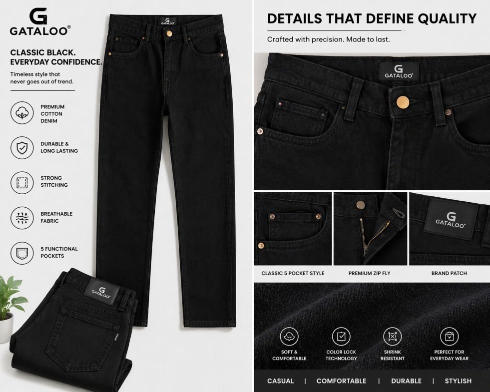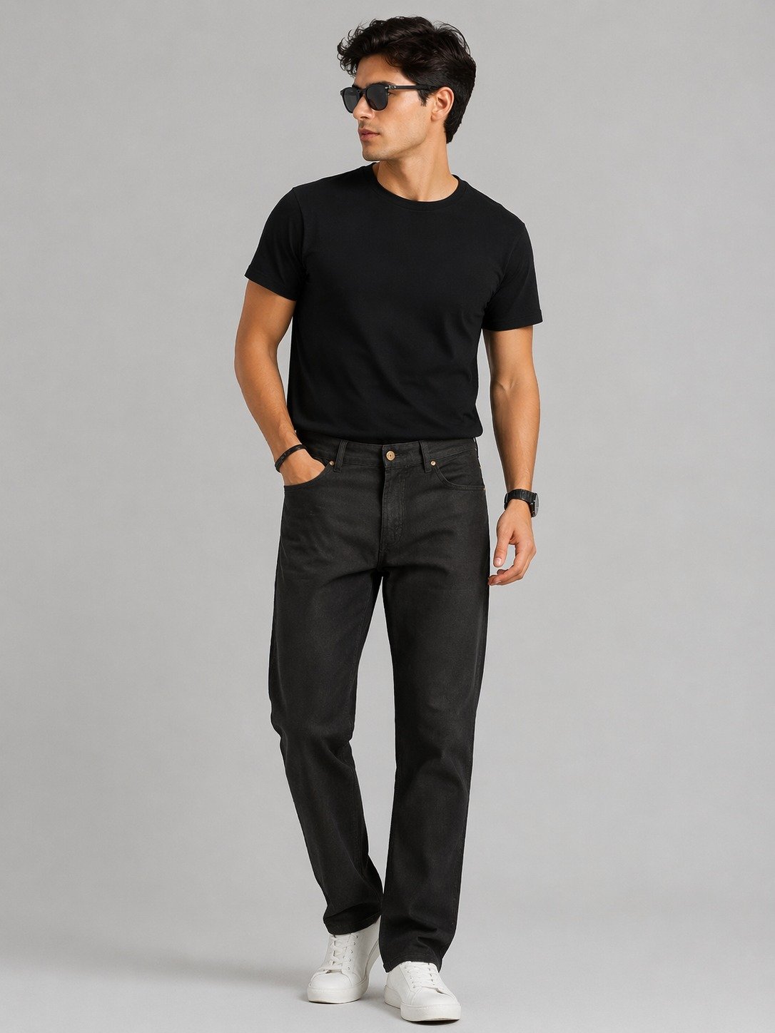 The solid black color gives a bold and classy appearance, making it ideal for both casual outings and semi-formal occasions. Its straight fit design ensures a relaxed yet stylish silhouette that complements all body types.