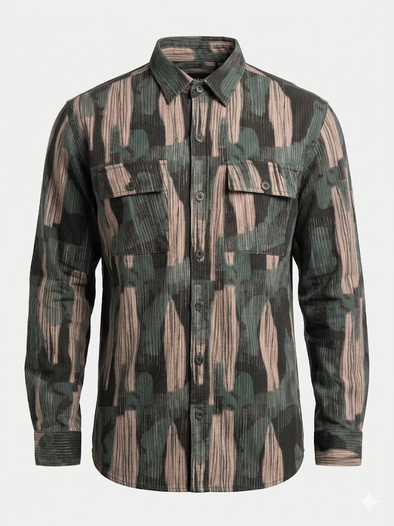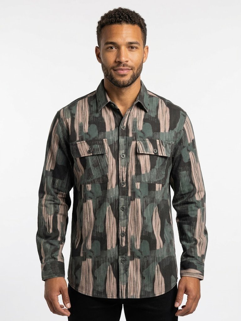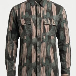 Enhance your everyday style with this trendy men’s camouflage printed casual shirt, designed for those who love bold and modern fashion. Featuring a unique mix of camouflage and brush-stroke patterns in earthy green and brown tones, this shirt offers a rugged yet stylish look.