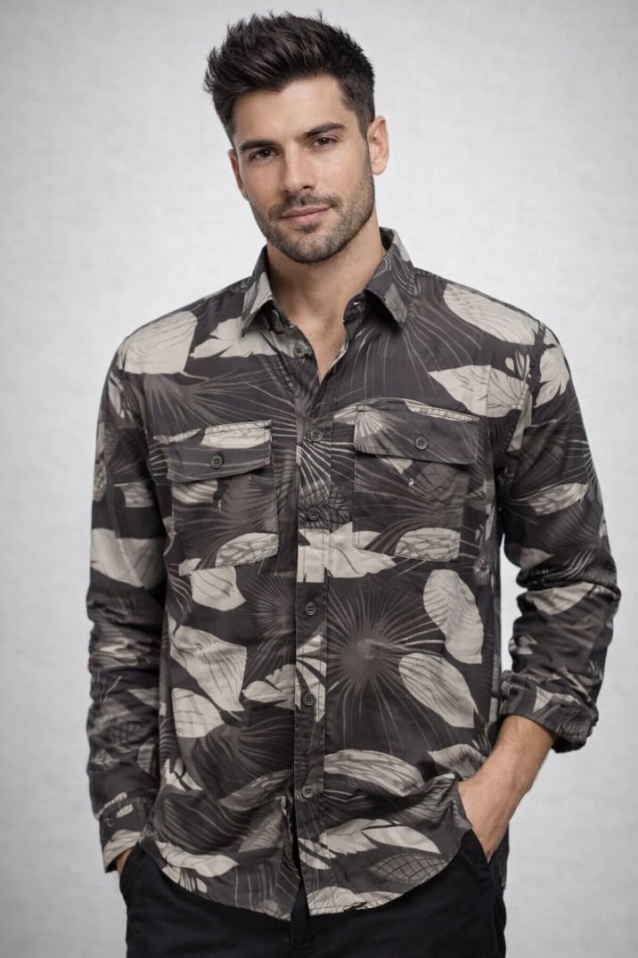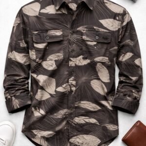 Stylish men’s dark floral printed shirt with trendy leaf design. Comfortable, modern, and perfect for casual and party wear.