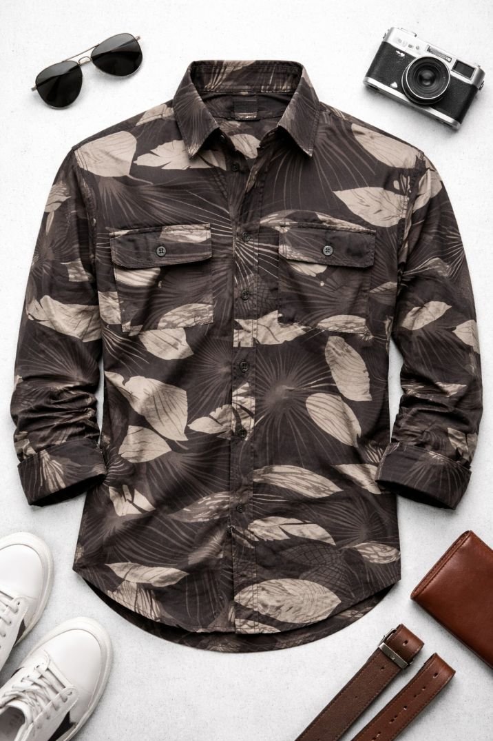 The dark base color combined with light leaf prints creates a rich contrast, giving you a standout appearance without being too flashy. Pair it with jeans or chinos for a complete smart casual look.