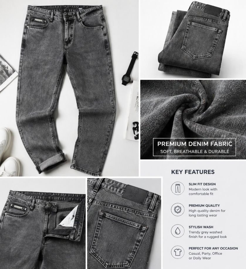 Step into effortless style with these premium quality grey washed denim jeans for men. Crafted from high-quality durable denim fabric, these jeans offer the perfect balance of comfort, flexibility, and fashion. The stylish washed finish gives a modern rugged look, making it ideal for both casual and semi-formal occasions.