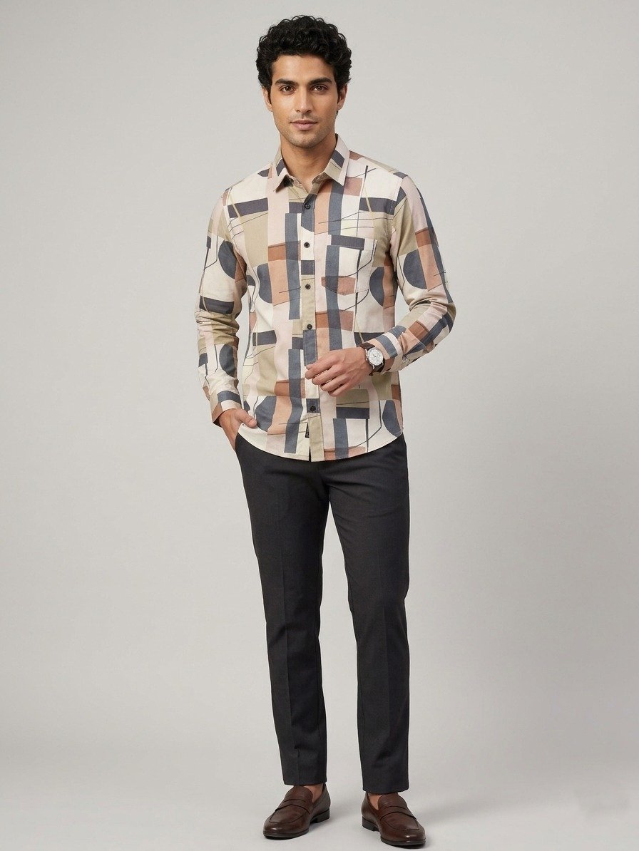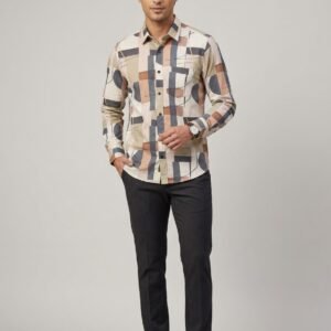 Upgrade your fashion game with this Men’s Multicolor Geometric Printed Full Sleeve Shirt, crafted for men who love bold and contemporary style. Featuring a unique abstract geometric print with soothing shades of blue, green, beige, and rust, this shirt stands out effortlessly.