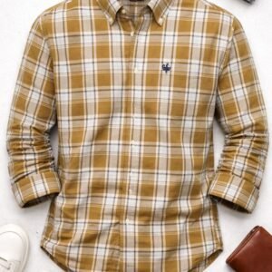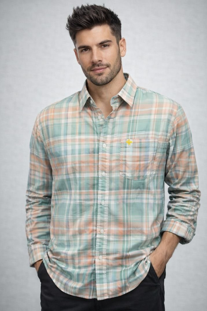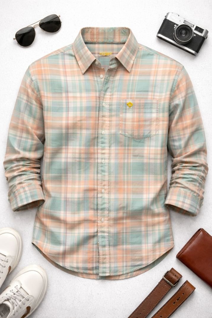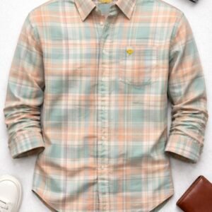 Upgrade your everyday style with this men’s pastel checkered casual shirt, designed for a fresh, modern, and classy look. Featuring a multi-color plaid pattern in soothing shades of green, peach, and white, this shirt is perfect for those who love subtle yet stylish fashion.