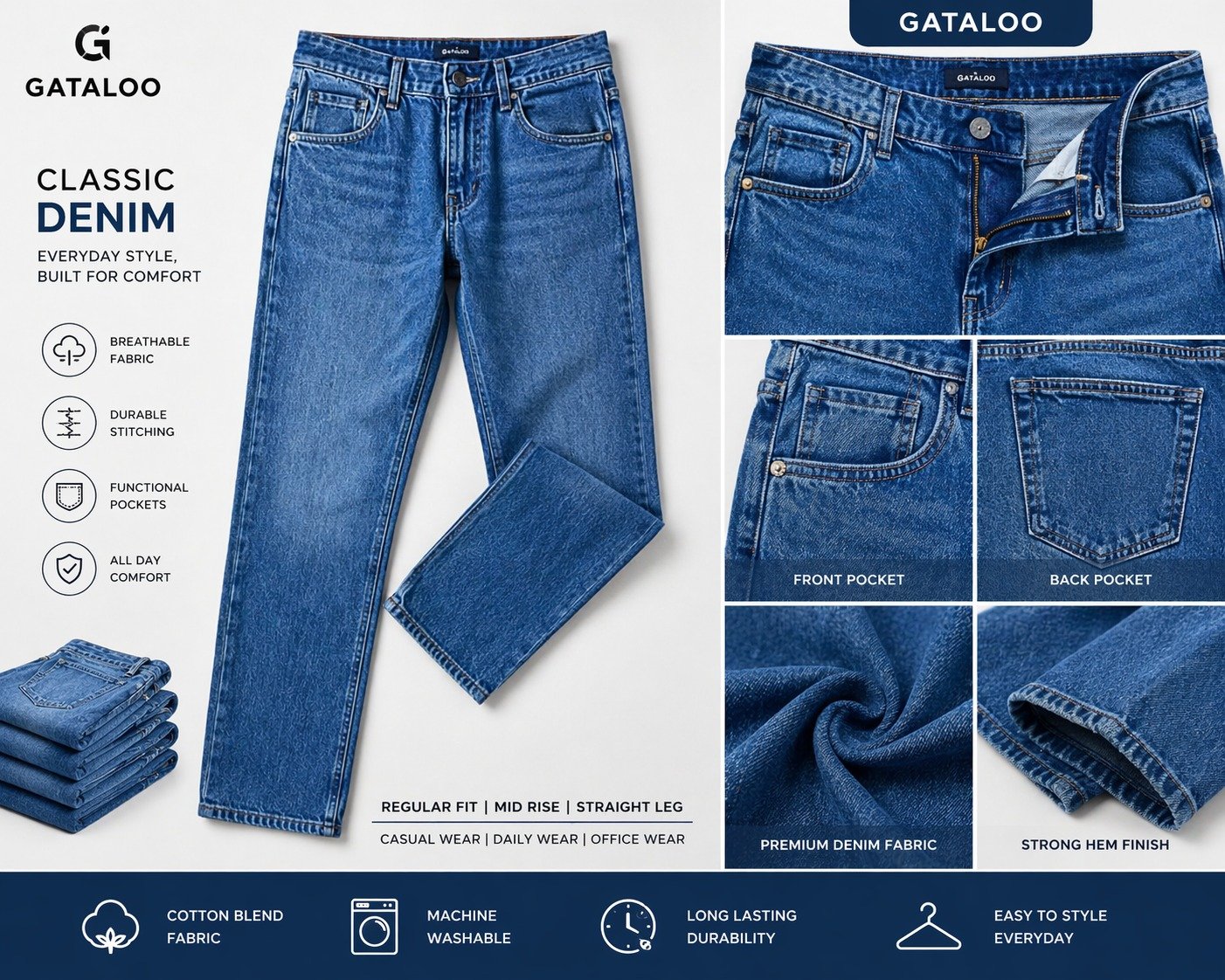 With strong stitching, functional pockets, and a comfortable waistband, this denim is built for long-lasting performance. The breathable fabric ensures all-day comfort, making it a must-have in every wardrobe.