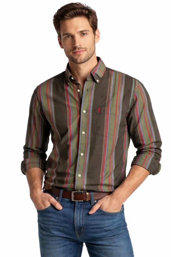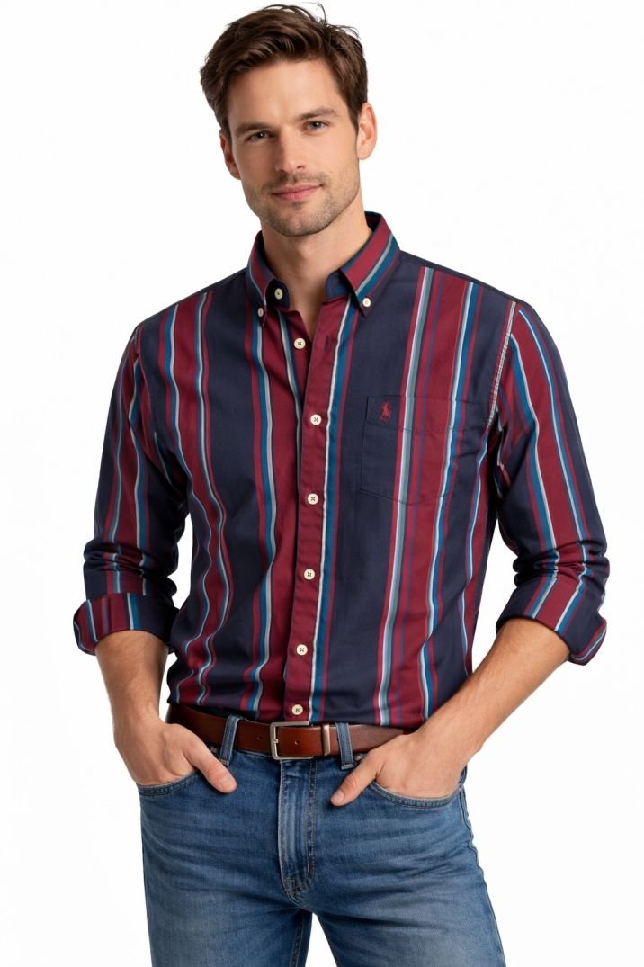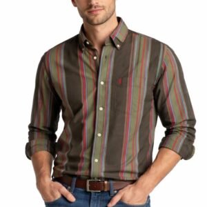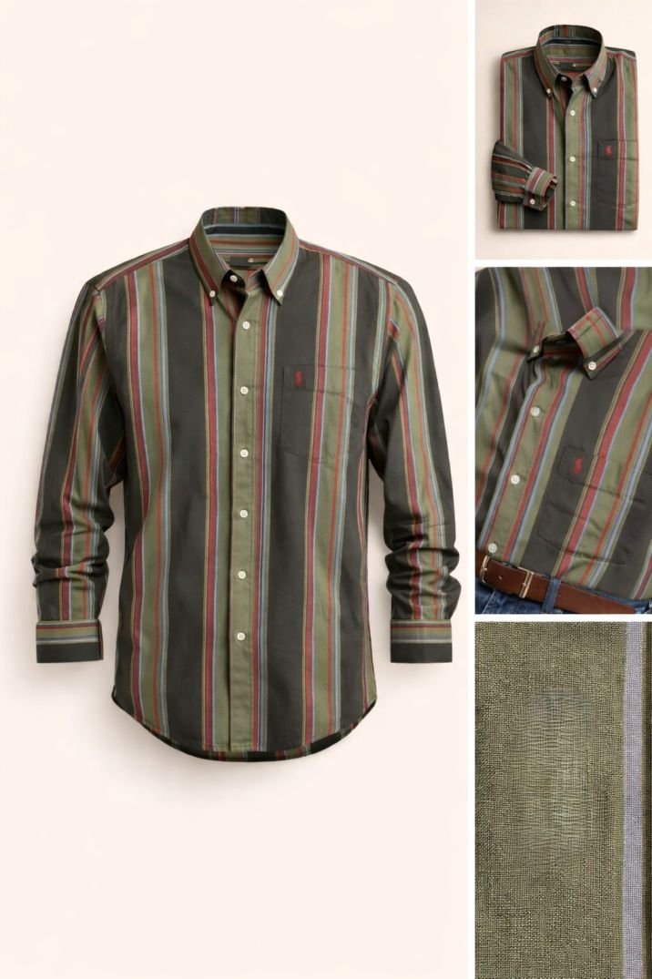 The unique multi-color vertical stripe pattern in shades of olive green, red, and subtle tones adds a bold yet classy touch, making it perfect for both casual outings and semi-formal occasions. The button-down collar and full sleeves give it a refined look, while the slim-fit design enhances your overall personality.