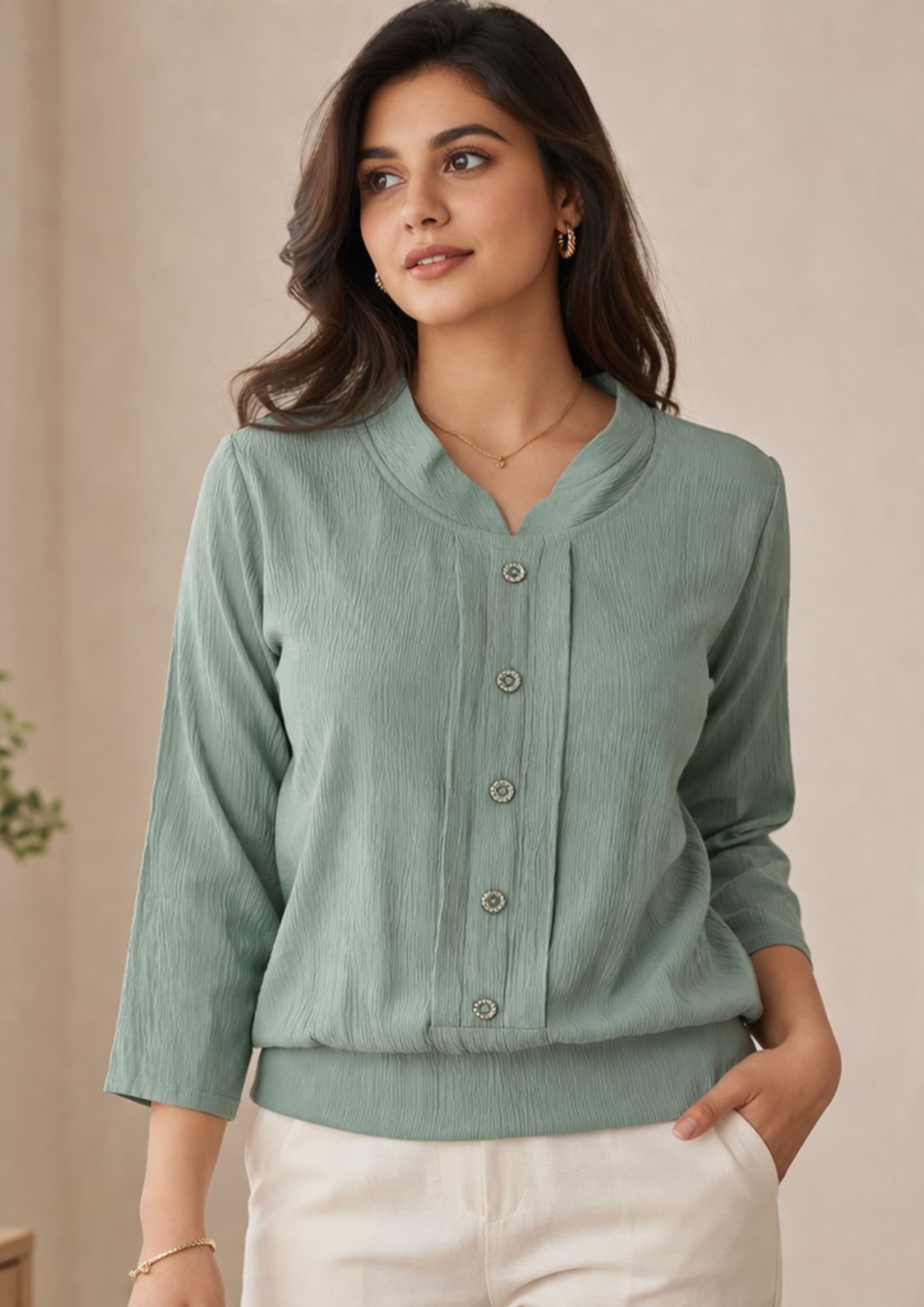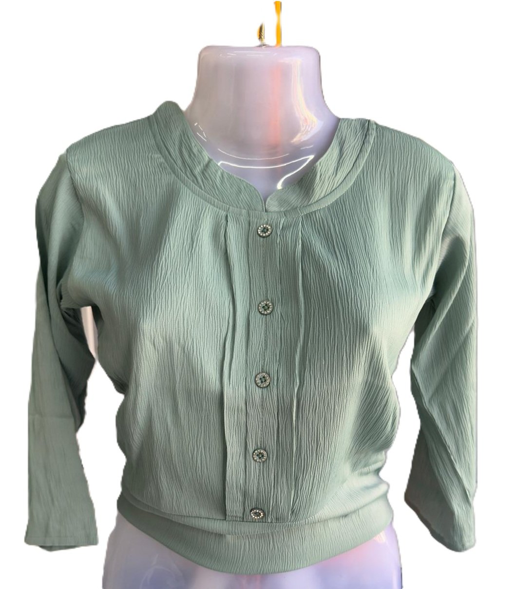 Stylish textured women top with button design, available in Seafoam green, baby pink, brown, and black – perfect for daily and office wear.