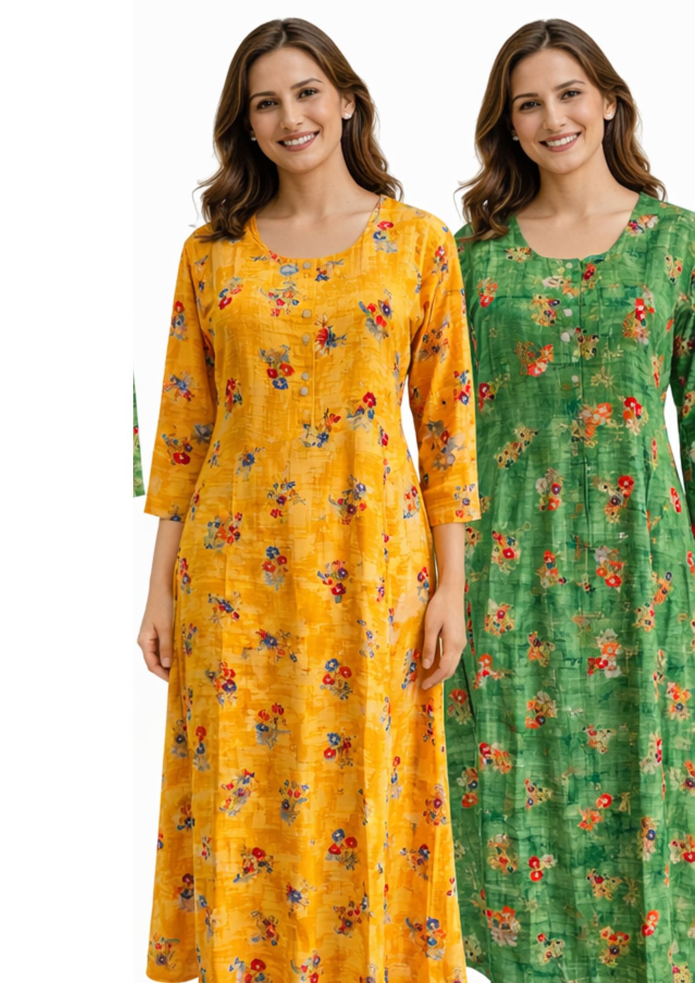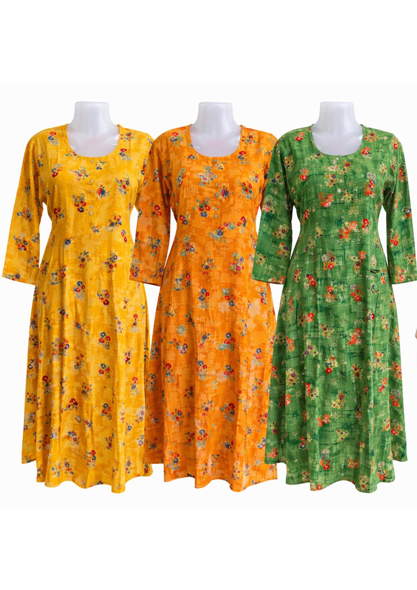 Trendy floral printed kurti dress for women available in yellow, orange, and green colors. Comfortable, lightweight, and perfect for daily wear and casual outings.