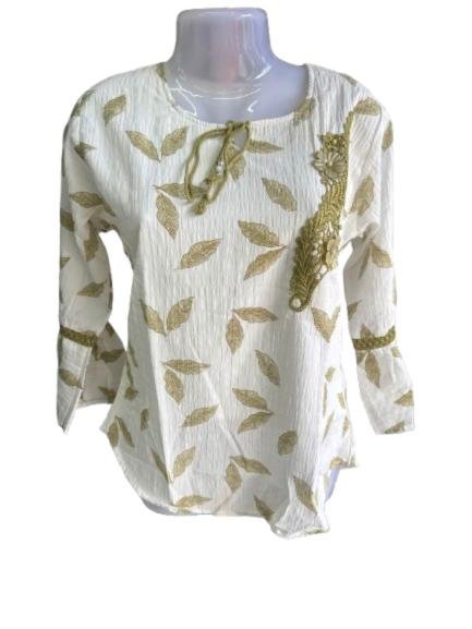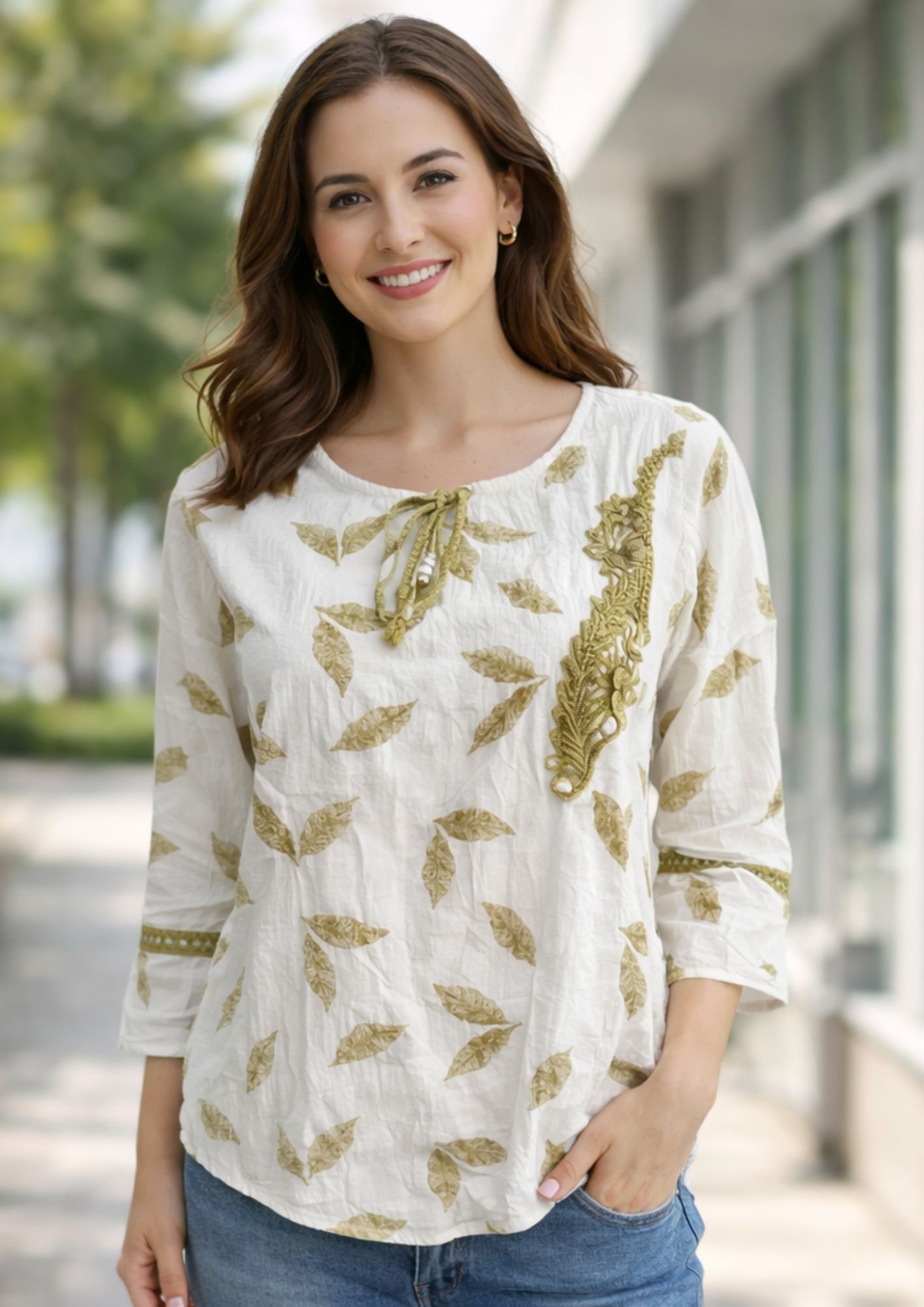 Featuring a beautiful leaf print pattern with intricate embroidery on the front, this top adds a touch of sophistication to your outfit. The round neckline with a tie-up detail enhances its feminine appeal, while the soft textured fabric provides a premium feel.