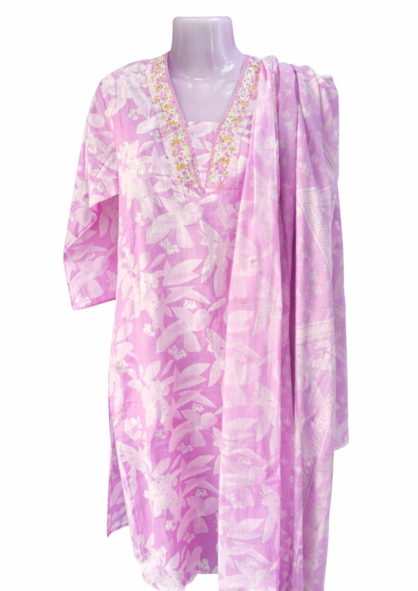 Beautiful pink floral printed kurta set with matching dupatta. Lightweight, comfortable, and perfect for daily wear, festive occasions, and casual outings.