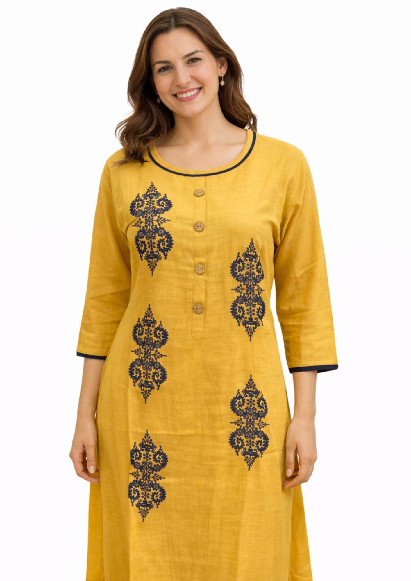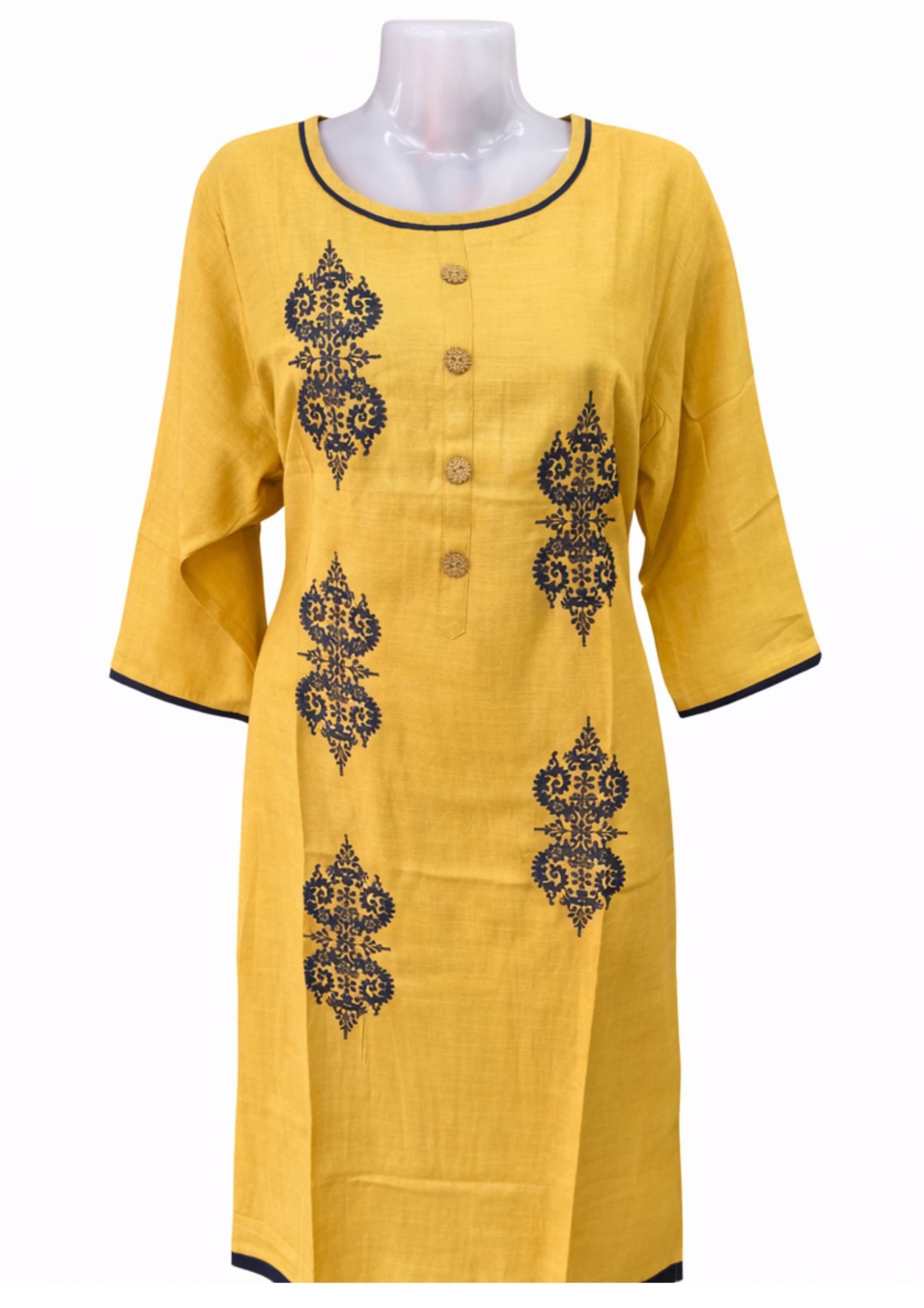 Featuring beautiful traditional-inspired prints on the front, this kurti offers a classy and eye-catching look. The round neckline with contrast piping and decorative buttons enhances its overall appeal, giving it a premium finish.