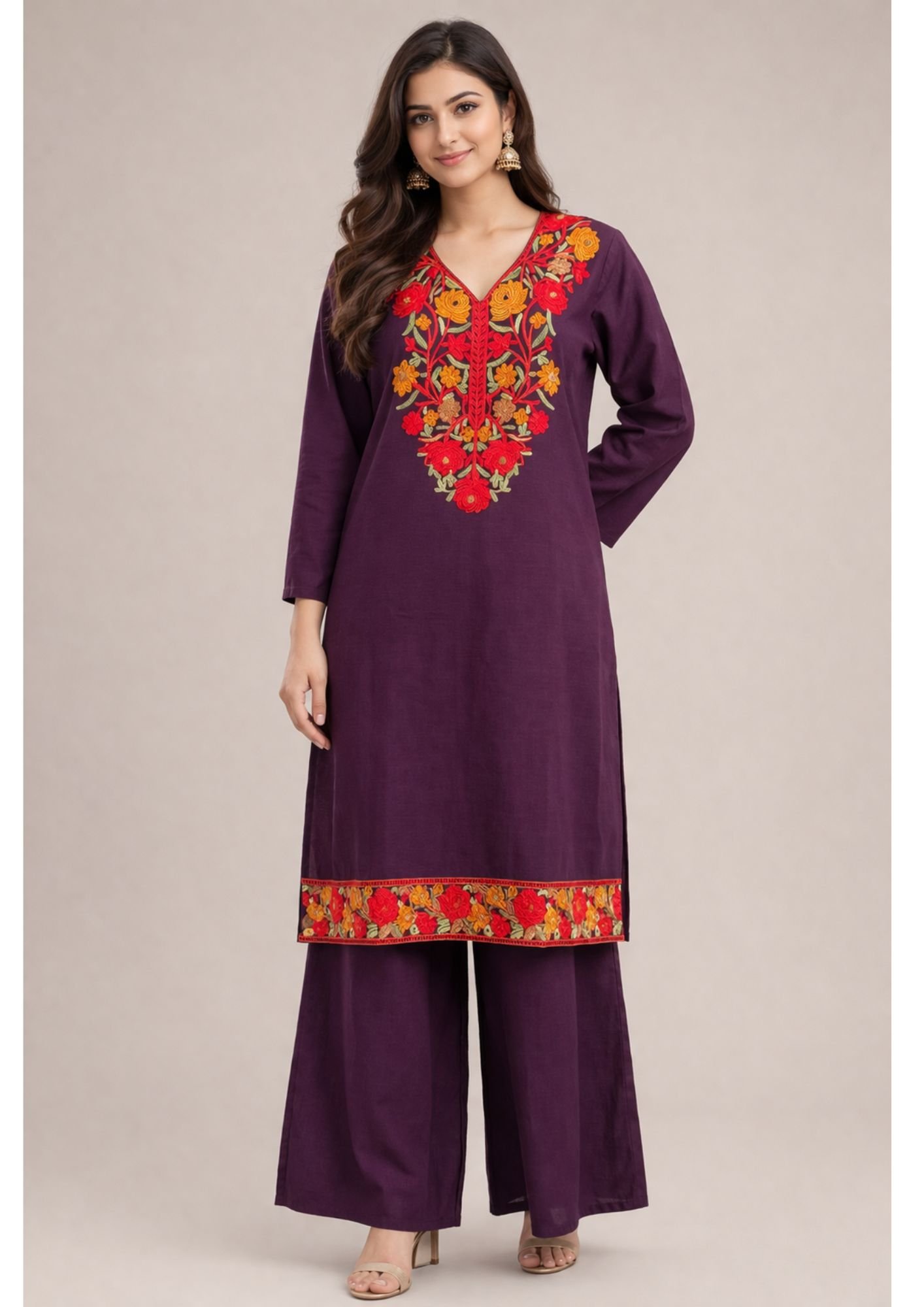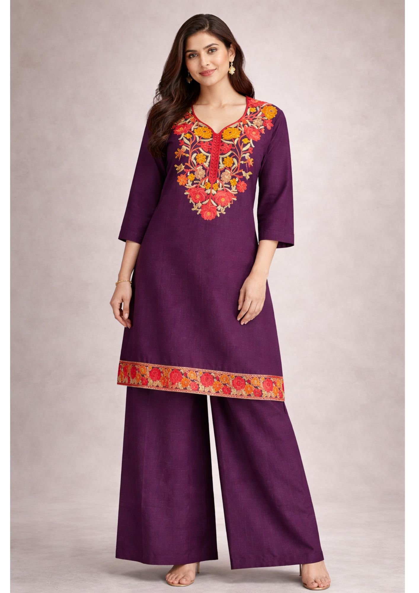The kurti features intricate multicolor floral embroidery on the neckline, adding a vibrant and eye-catching appeal. The rich purple color enhances its royal and classy look, making it suitable for festive occasions as well as casual gatherings.