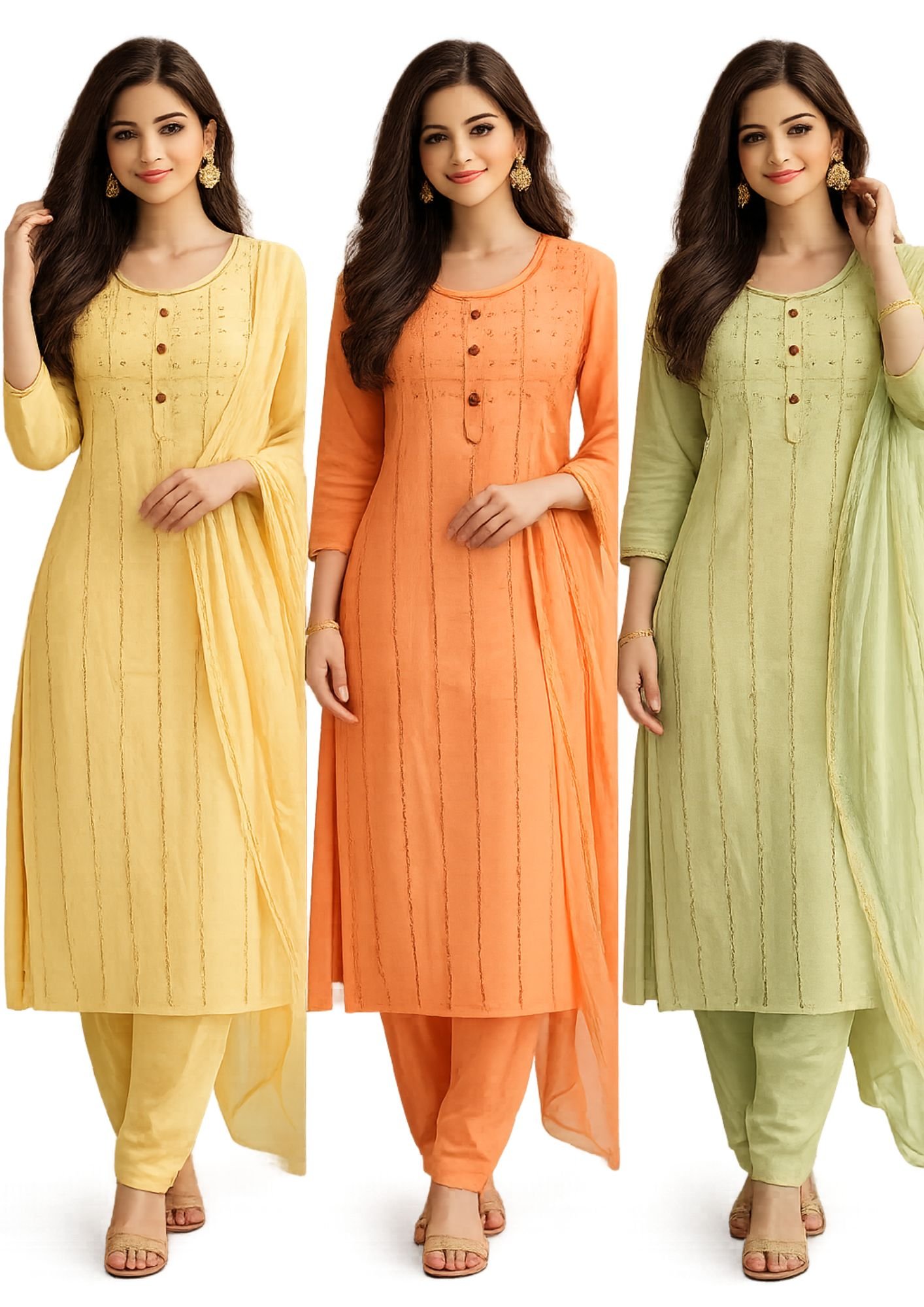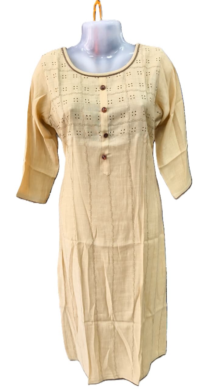 The kurti features a straight-fit silhouette that flatters all body types. Its round neckline and 3/4 sleeves provide a modern yet traditional look. The front button detailing enhances its stylish appeal, while the subtle embroidered pattern on the upper panel adds a classy and refined touch.